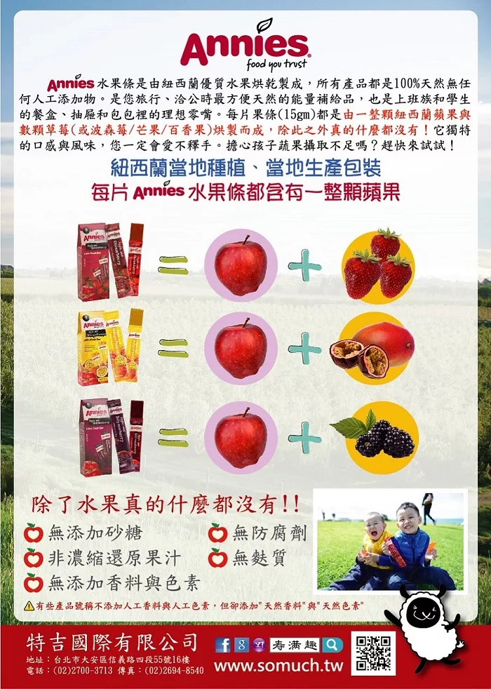 博客來-【壽滿趣- 紐西蘭原裝進口】Annies 全天然水果條(百香芒果6盒, 36片家庭裝)訂購網址: https://www.books.com.tw/exep/assp.php/87926/products/N010868749?utm_source=87926&utm_medium=ap-books&utm_content=recommend&utm_campaign=ap-201911