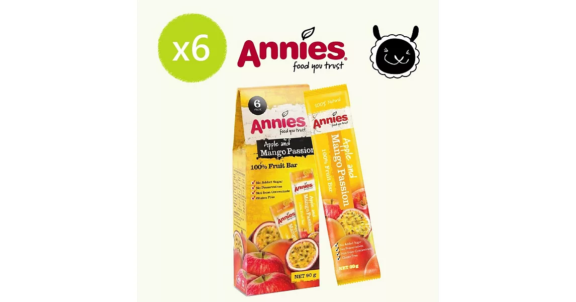 商品描述: 【壽滿趣- 紐西蘭原裝進口】Annies 全天然水果條(百香芒果6盒, 36片家庭裝)