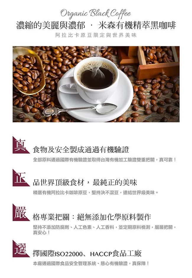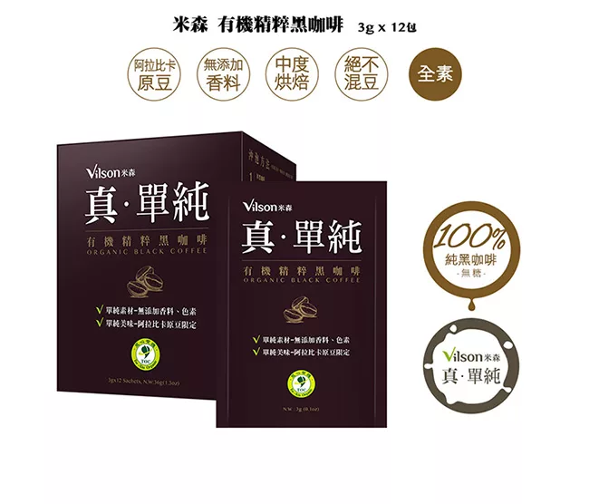 商品描述: 【米森】有機精粹黑咖啡(3g*12包/盒)