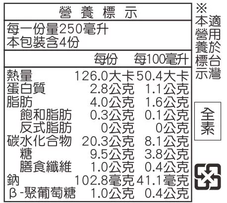 注意事項:飲用前請搖勻,如有沉澱為燕麥成分可能產生的現象。
