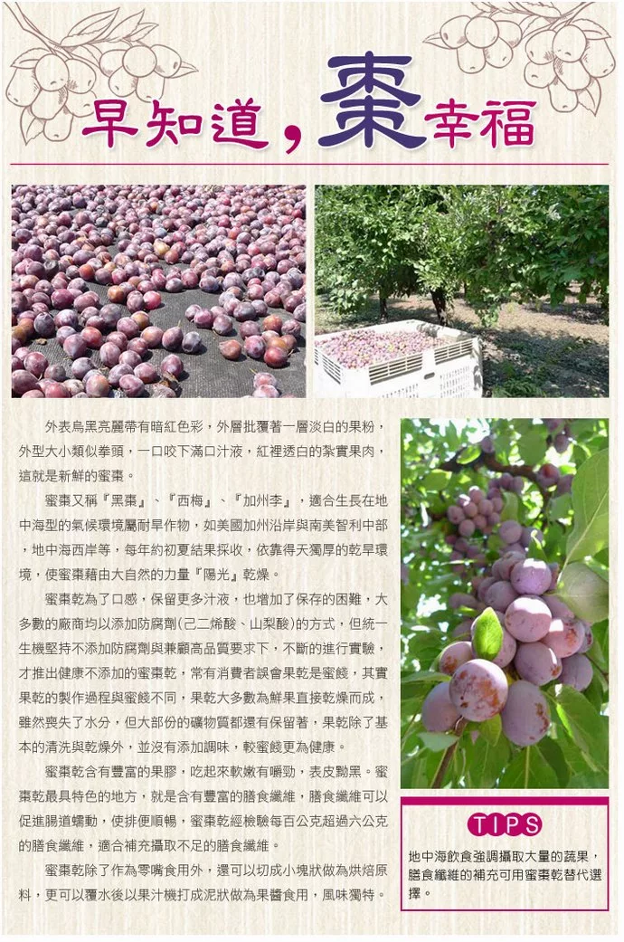 顆粒大、肉質厚實;陽光日曬而成,非蜜餞產品,不添加人工色素、人工香料、防腐劑,呈現原始的口感與滋味;零脂肪又富含膳食纖維,可增加飽足感,促進腸道蠕動,是需補充膳食纖維的補充來源。