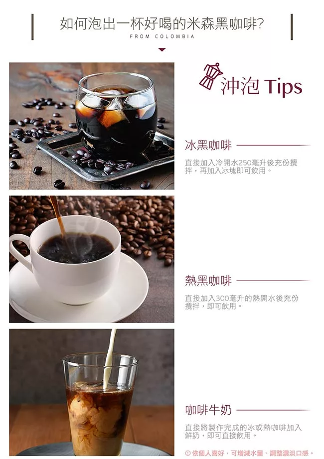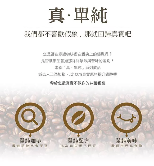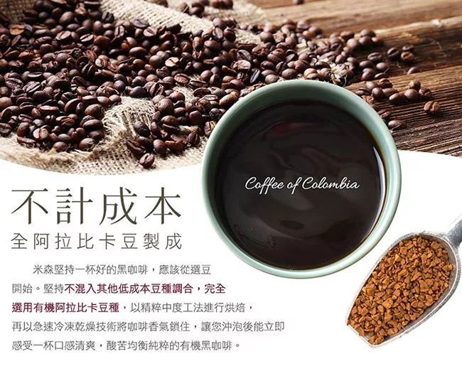 米森堅持一杯好的黑咖啡,應該從選豆開始。堅持不混入其他低成本豆種調合,完全選用阿拉比卡豆種,以精粹中度工法進行烘焙,再以急速冷凍乾燥技術將咖啡香氣鎖住,讓您感受一杯口感清爽,酸苦均衡純粹的黑咖啡。