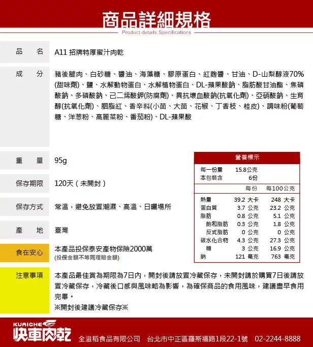 商品描述: 【南門市場快車】招牌特厚蜜汁豬肉乾(95g)