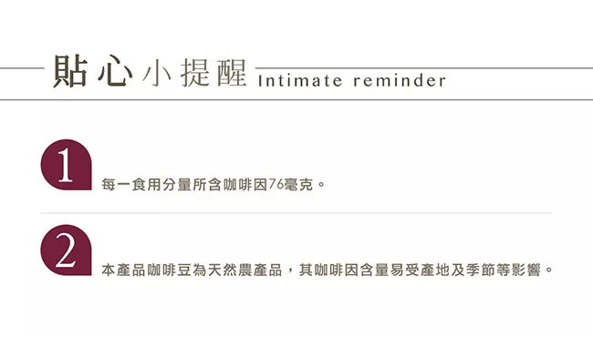 咖啡因含量約95毫克,咖啡豆為天然農產品,咖啡因含量受產地季節影響。