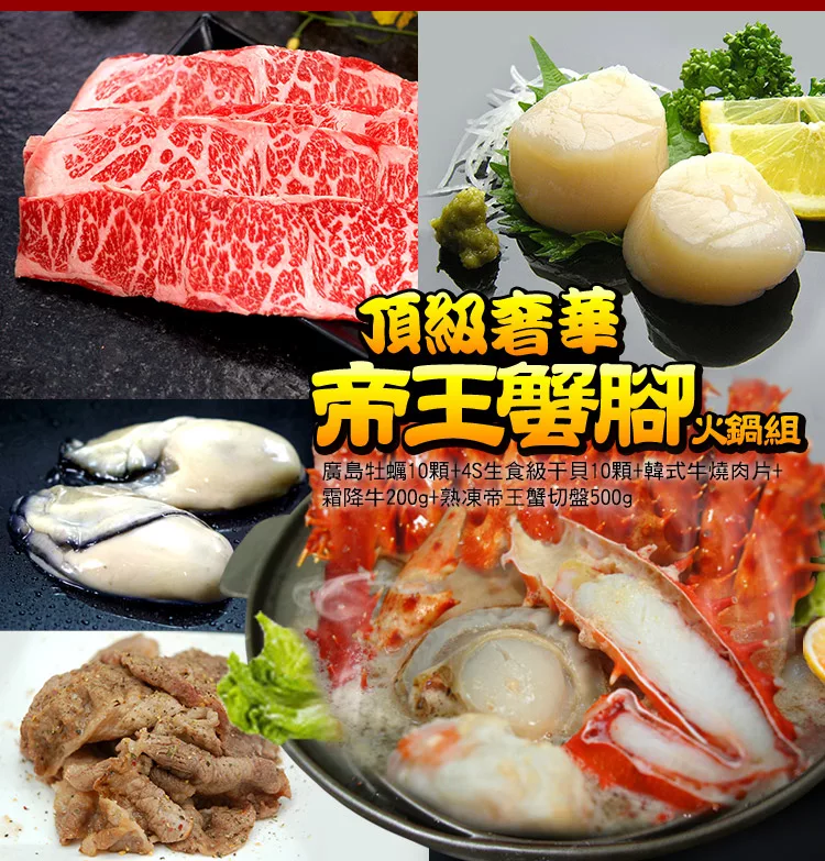 →→→→更多詳細”頂級奢華帝王蟹腳海鮮火鍋組 (廣島牡蠣10顆+4S生食級干貝10顆+韓式牛燒肉片+霜降牛200g+熟凍帝王蟹切盤500g)”介紹請點我