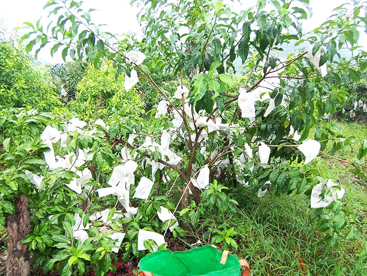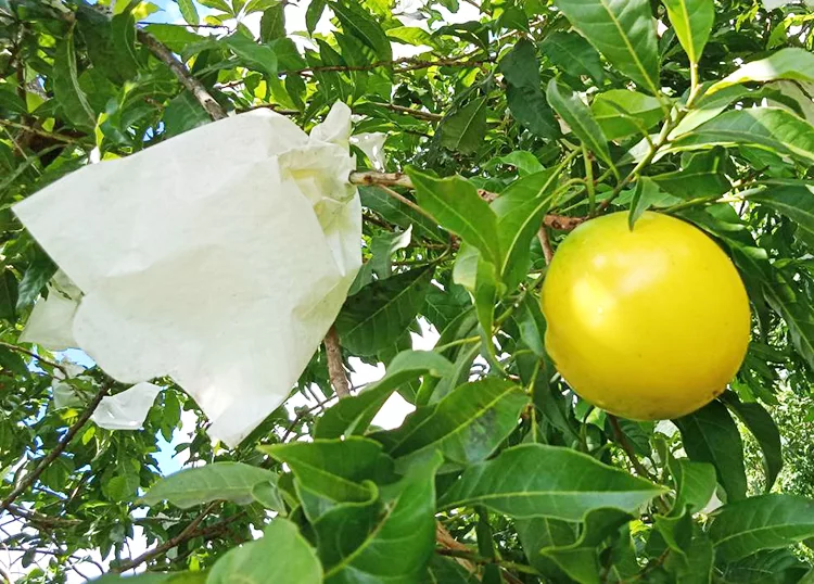 | 果農不使用農藥,每一顆黃金果都細心套袋照顧 。