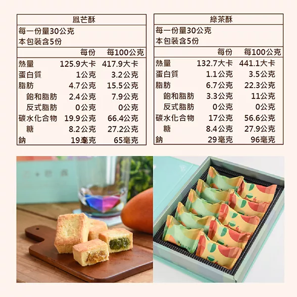 綠茶酥-本產品含有乳製品、雞蛋、小麥麩質、大豆及其製品,不適合對其過敏體質者食用。