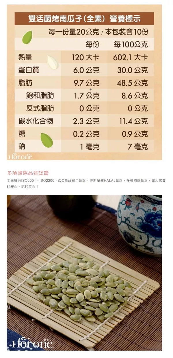 | 熱量 | 每份10公克,51.4大卡。本包裝含25份 |