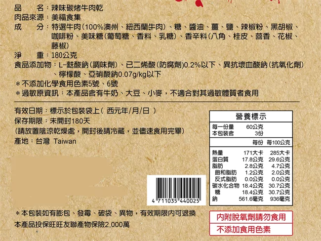 商品描述: [林東芳] 辣味碳烤牛肉乾(180g)
