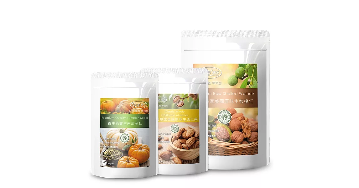 商品說明: 【樸優樂活】原味堅果DIY烘焙超值組-無經烘焙(核桃+杏仁果+南瓜子)