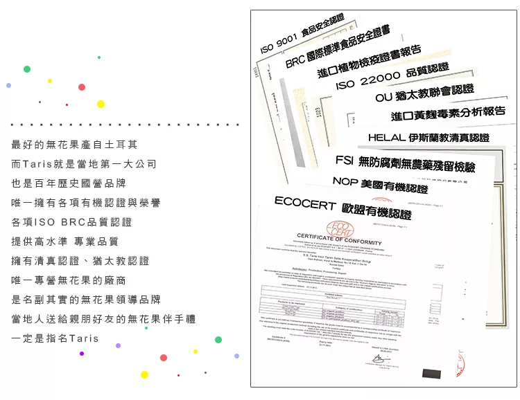 ★Taris無花果為土耳其唯一百年國營品牌,官方認證名品,100%純天然,未經漂白、糖漬、醃漬等任何化學處理。