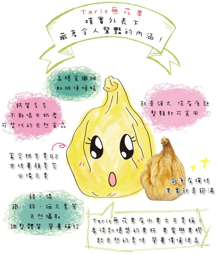 其他疑問? 無花果須經由無花果蜂授粉,果實內部才能開花成熟結果,就像台灣普遍常吃的蘋果、荔枝、蓮霧、龍眼、桃、梨等常見的水果皆需蜜蜂等昆蟲授粉,也因天然果糖較為豐富,也容易引昆蟲來採蜜,水果會有的狀況,無花果也可能會有,若有極低的機率誤食昆蟲形體也不必驚慌,並不會造成身體病理傷害,這些與米蟲一樣都是無害的,也證明Taris無花果無任何農藥噴灑。Taris之所以廣受歐美日韓與台灣消費者的喜愛,因100年只銷售天然無花果乾!