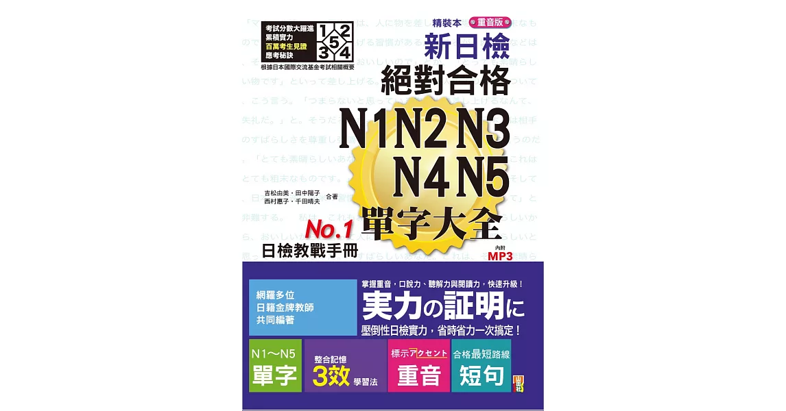 博客來-精裝本 重音版 新日檢 絕對合格 N1,N2,N3,N4,N5單字大全(25K+2MP3)訂購網址: https://www.books.com.tw/exep/assp.php/87926/products/0010780491?utm_source=87926&utm_medium=ap-books&utm_content=recommend&utm_campaign=ap-202001