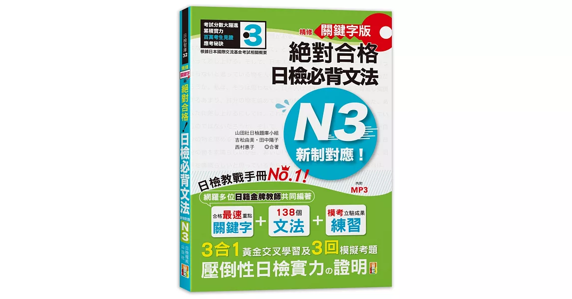 →→→→更多詳細”精修關鍵字版 新制對應 絕對合格!日檢必背文法N3:附三回模擬試題 (25K+MP3)”介紹請點我