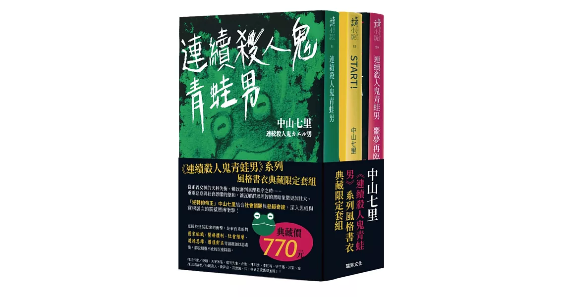 博客來-連續殺人鬼青蛙男系列典藏限定套組:【特殊主題風格書衣新裝版】訂購網址: https://www.books.com.tw/exep/assp.php/87926/products/0010812635?utm_source=87926&utm_medium=ap-books&utm_content=recommend&utm_campaign=ap-201903