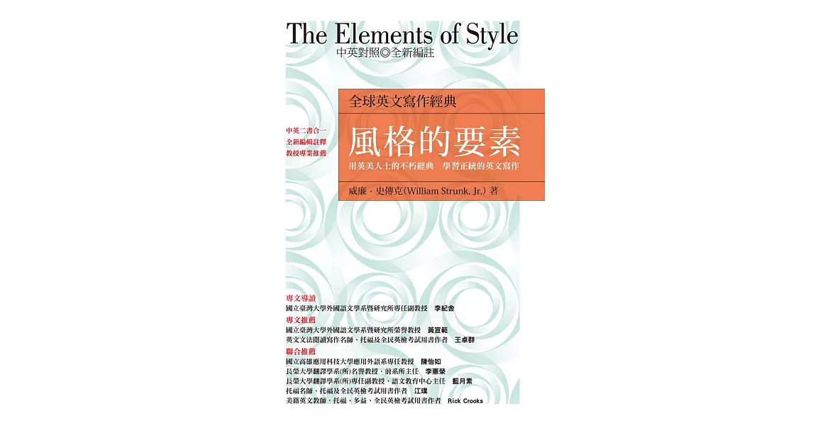 我以前就擁有《風格的要素》這本書,對於母語非英語者來說,這本書可以提供很不錯的指引,值得推薦給所有學習英文寫作或翻譯的學生。──藍月素|長榮大學翻譯學系專任副教授暨語文教育中心主任