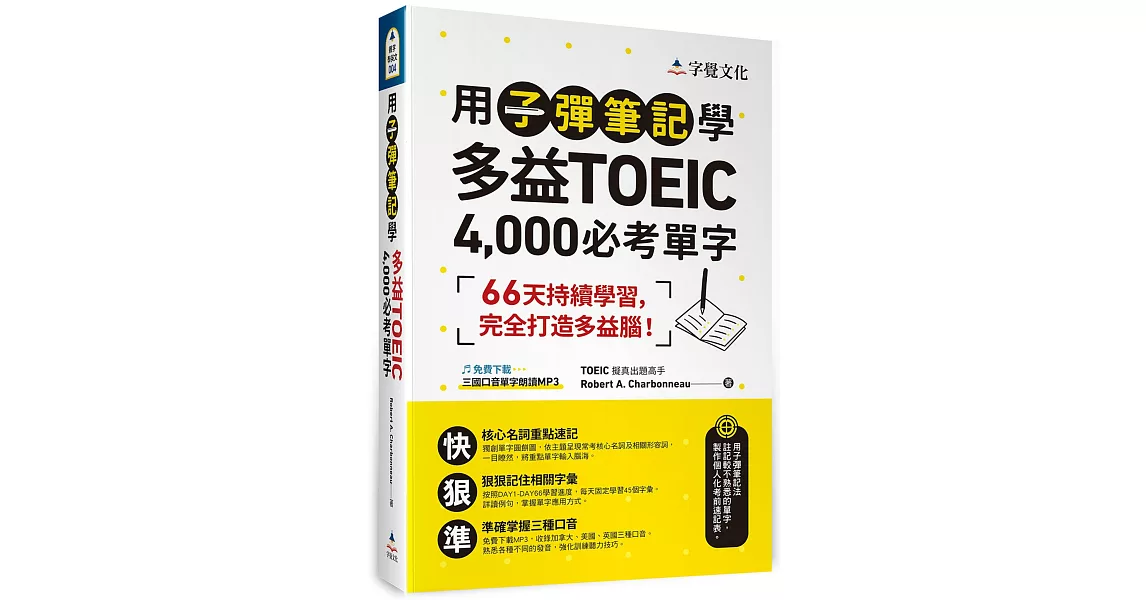 商品描述: 書名:用子彈筆記學多益TOEIC 4,000必考單字(附QR Code),語言:繁體中文,ISBN:9789869870955,頁數:480,出版社:字覺文化,作者:Robert A. Charbonneau,出版日期:2020/06/10,類別:語言學習