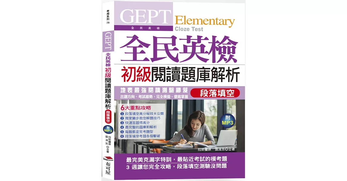博客來-GEPT全民英檢初級閱讀題庫解析(段落填空):3週完全攻略克漏字測驗(附MP3)訂購網址: https://www.books.com.tw/exep/assp.php/87926/products/0010851770?utm_source=87926&utm_medium=ap-books&utm_content=recommend&utm_campaign=ap-201906