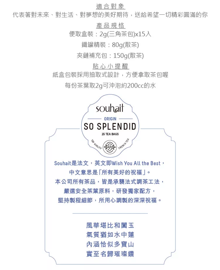 商品描述: Souhait Tea清甘醇美頂級大吉嶺紅茶 茶葉 80g罐 – So Splendid 美花豐實
