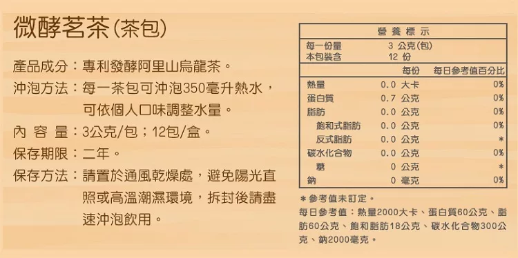 | 營養標示: | 每一份量2公克(1包);本包裝含15份 |