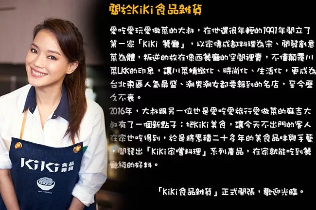 愛吃愛玩愛做菜的大叔,在他還很年輕的1991年開立了第一家「KiKi 餐廳」,以家傳成都料理為宗、開發創意菜為體,叛逆的放在像西餐廳的空間裡賣,不僅顛覆川菜LKK的印象,讓川菜精緻化、時尚化、生活化,更成為台北東區人氣最盛、潮男潮女都要報到的名店,至今歷久不衰。從此,川菜跟川劇一樣變臉了,不再是老爸老媽久久上一次的館子,而是每個人想解饞、想約會,隨時就能走進的咖啡館。為了服務更多饕客,1999年後,大叔陸續展開設信義、東豐、復興旗艦等分店;2006年更進軍台中美食一級戰區的公益路,征服中部人的味蕾。而嗜吃愛做泰國菜的大叔自己也一路不斷精進,2009年跨足泰式料理,以傳統家常菜把客人吃得死死的,一試成主顧。2011年起他走進誠品,創造第一家誠品商場店,爾後新板誠品川菜、文創Kiki Thai Café、天母誠品Kiki川菜接連開立,他早就讓美食成為一種吃的文創。2016年,大叔跟另一位也是愛吃愛旅行愛做菜的麻吉大叔有了一個新點子:把KiKi美食,讓今天不出門的客人在家也吃得到,於是將累積二十多年的美食品味與手藝,開發出「KiKi家嚐料理」系列產品,在家就能吃到餐廳級的好料。